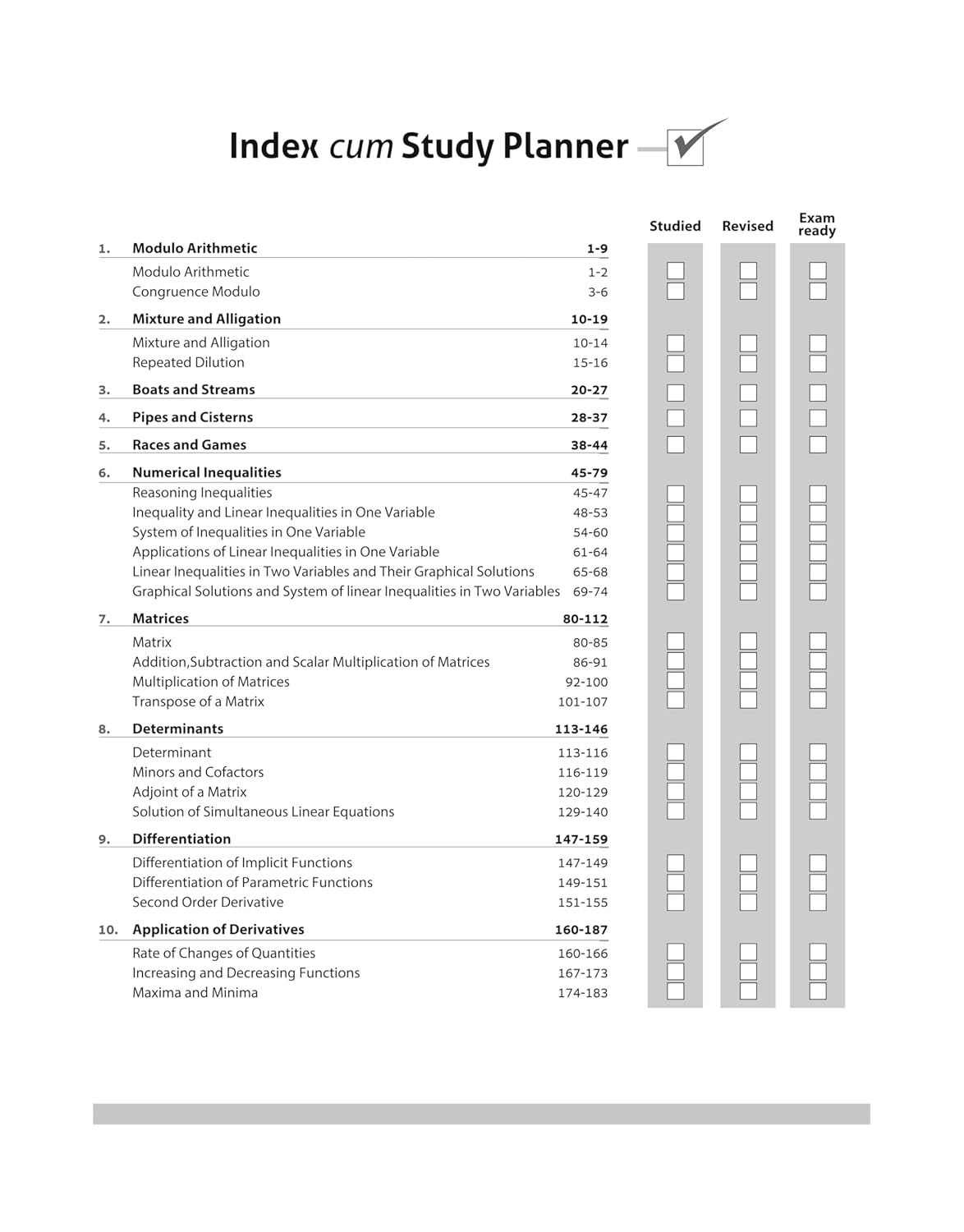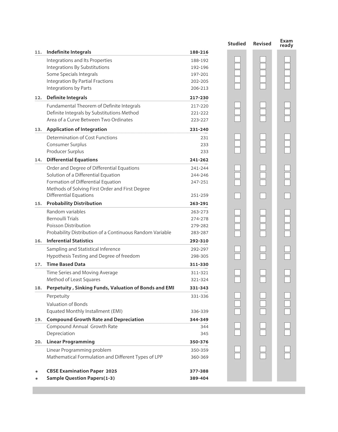 Modulo Arithmetic, Mixture and Alligation, Boats and Streams, Pipes and Cisterns, Races and Games, Numerical Inequalities, Matrices, Determinants, Differentiation, Application of Derivatives, Indefinite Integrals, Definite Integrals, Application of Integration, Differential Equations, Probability Distribution, Inferential Statistics, Index Numbers and Time Based Data, Perpetuity, Sinking Funds and EMI, Return, Growth and Depreciation, Linear Programming, CBSE Examination Paper (2024 & 2025) Sample Question Papers (1-3)