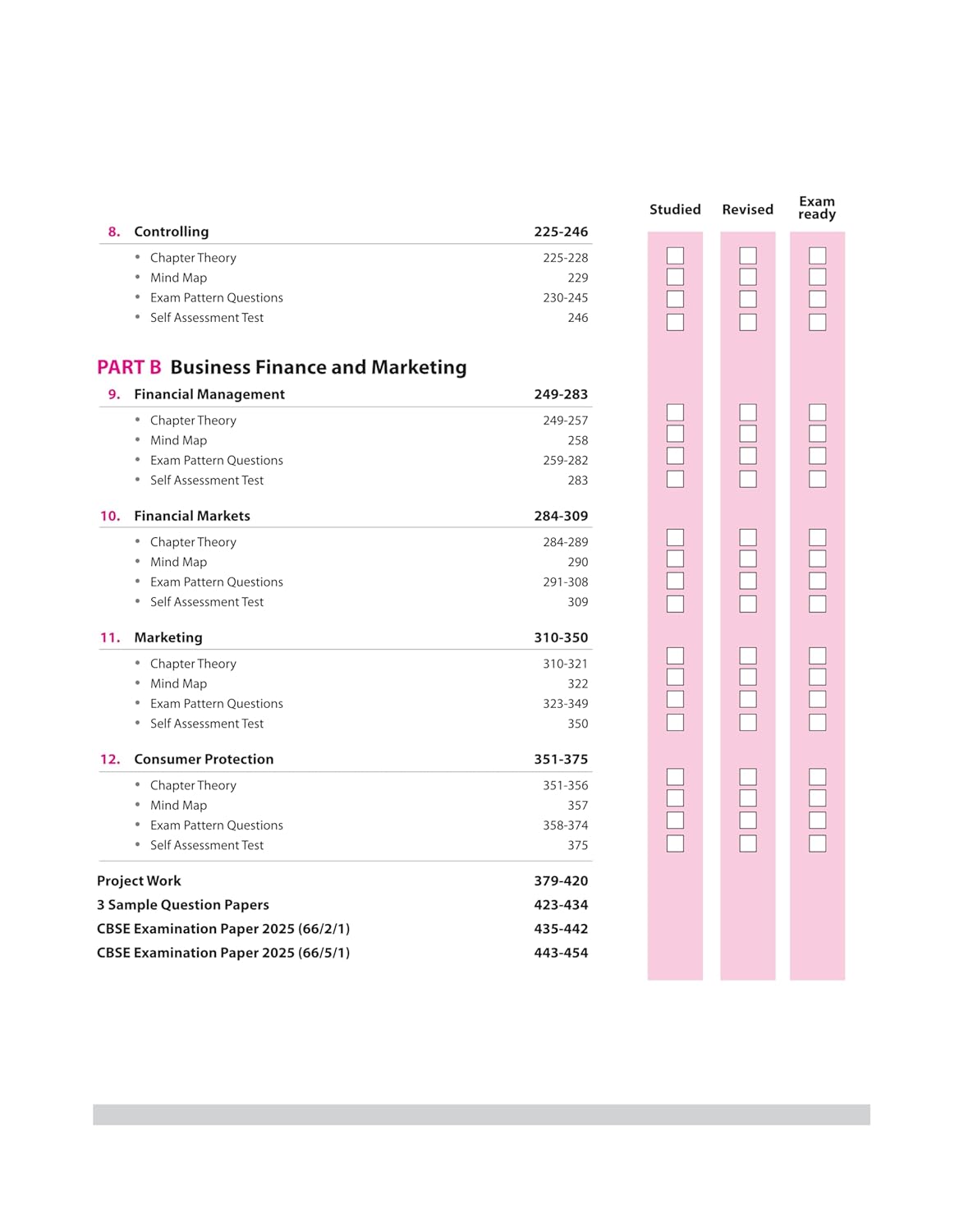 PART A: Principles and Functions of Management (Nature and Significance of Management, Principles of Management, Business Environment, Planning, Organising, Staffing, Directing, Controlling, PART B: Business Finance and Marketing (Financial Management, Financial Markets, Marketing, Consumer Protection), Project Work, 3 Sample Question Papers, CBSE Examination Paper 2025