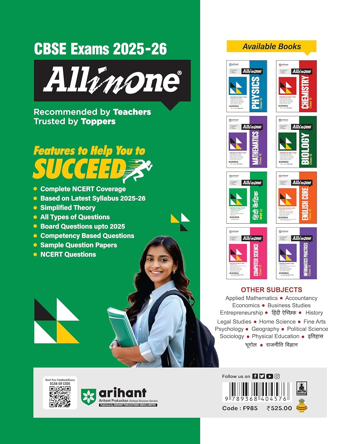 Arihant's All-in-One series has been the #1 choice of students and teachers for over a decade. Known for its well-structured content, exam-oriented approach, and easy-to-understand language, this series ensures complete concept clarity and thorough practice. Each book is meticulously crafted to align with the latest CBSE syllabus and exam pattern, making it a trusted companion for students aiming for academic excellence.