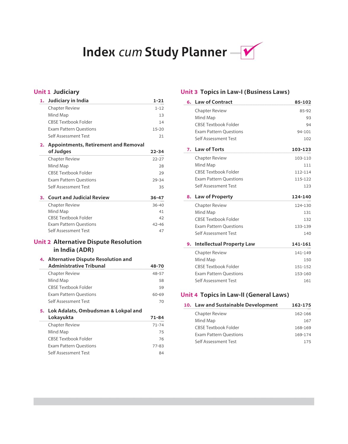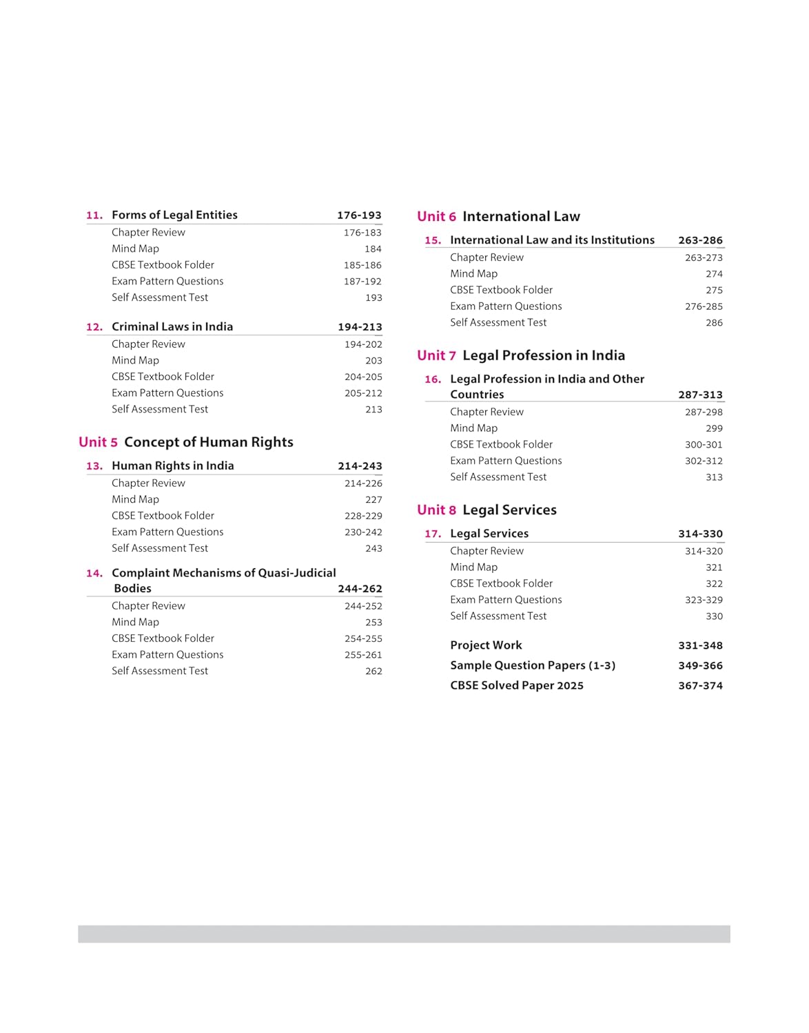 Unit I: Judiciary, Unit II: Alternative Dispute Resolution in India, Unit III: Topics in Law-I, Unit IV: Topics in Law-II, Unit V: Concept of Human Rights, Unit VI: International Law, Unit VII: Legal Profession in India, Unit VIII: Legal Services, Project Work, Sample Question Papers (1-3), CBSE Solved Paper 2025