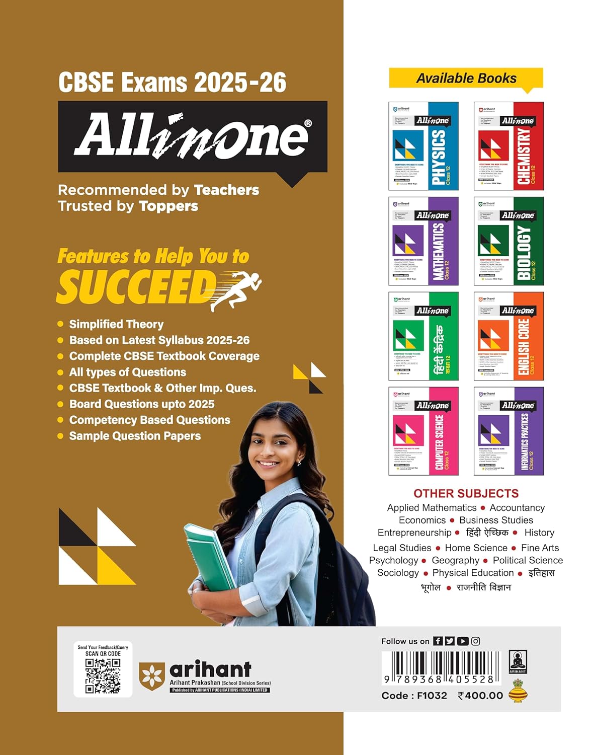 Arihant's All-in-One series has been the #1 choice of students and teachers for over a decade. Known for its well-structured content, exam-oriented approach, and easy-to-understand language, this series ensures complete concept clarity and thorough practice. Each book is meticulously crafted to align with the latest CBSE syllabus and exam pattern, making it a trusted companion for students aiming for academic excellence.