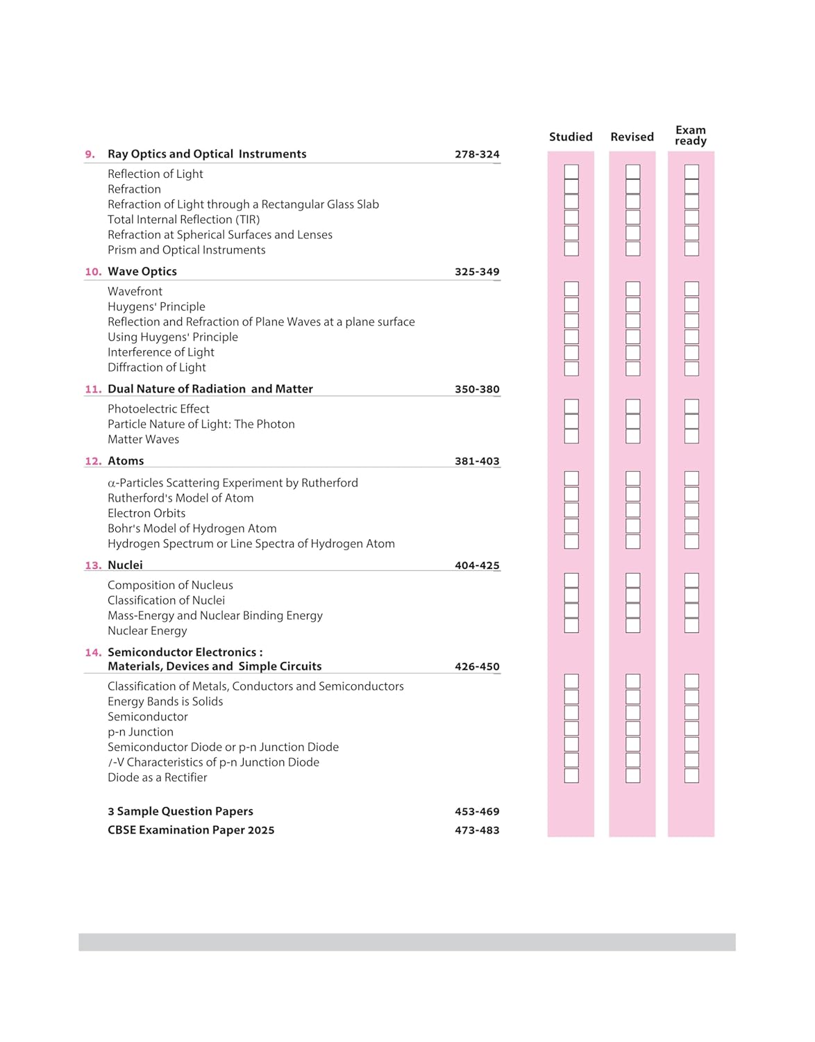 Electric Charges and Fields, Electrostatic Potential and Capacitance, Current Electricity, Moving Charges and Magnetism, Magnetism and Matter, Electromagnetic Induction, Alternating Current, Electromagnetic Waves, Ray Optics and Optical Instruments, Wave Optics, Dual Nature of Radiation and Matter, Atoms, Nuclei, Semiconductor Electronics: Materials, Devices and Simple Circuits, Sample Question Papers (1-3), CBSE Examination Paper 2025