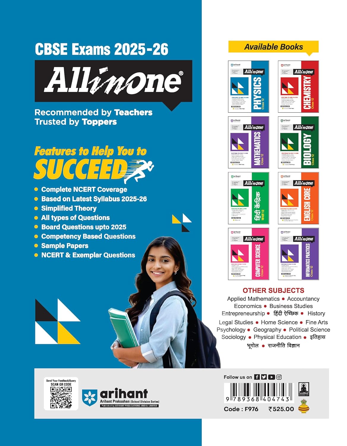 Arihant's All-in-One series has been the #1 choice of students and teachers for over a decade. Known for its well-structured content, exam-oriented approach, and easy-to-understand language, this series ensures complete concept clarity and thorough practice. Each book is meticulously crafted to align with the latest CBSE syllabus and exam pattern, making it a trusted companion for students aiming for academic excellence.