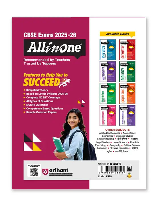 Arihant's All-in-One series has been the #1 choice of students and teachers for over a decade. Known for its well-structured content, exam-oriented approach, and easy-to-understand language, this series ensures complete concept clarity and thorough practice. Each book is meticulously crafted to align with the latest CBSE syllabus and exam pattern, making it a trusted companion for students aiming for academic excellence.