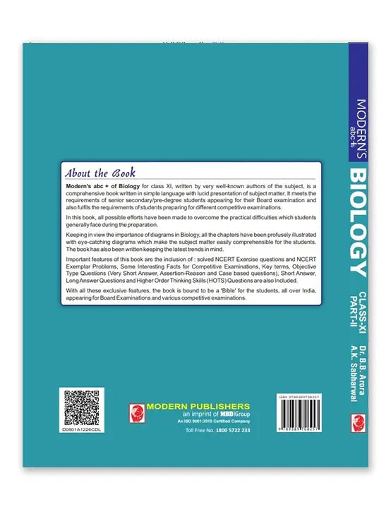 Modern's ABC + of Biology for class XII, written by very well-known authors of the subject, is a comprehensive book written in simple language with lucid presentation of subject matter. It meets the requirements of senior secondary/pre-degree students appearing for their Board examination and also fulfils the requirements of students preparing for different competitive examinations.